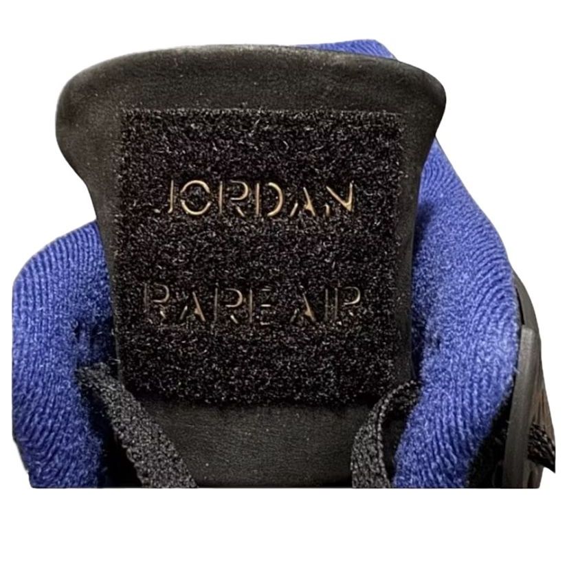 Black and royal blue Air Jordan 4 Retro "Rare Air" with Gold lettering inside shoes tongue. Features a nubuck upper, grey suede overlays, and interchangeable Velcro tongue patches. Boasts visible Air cushioning, "Rare Air" insole logo, and removable Jumpman patch. A classic, reimagined.