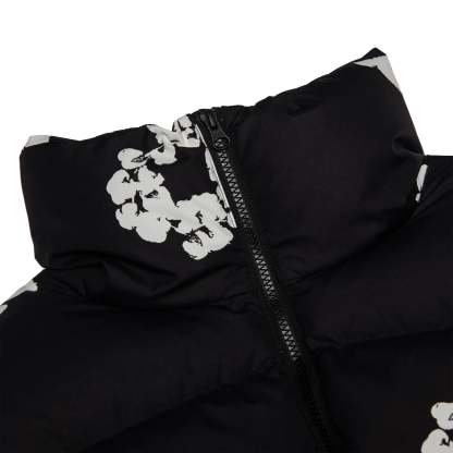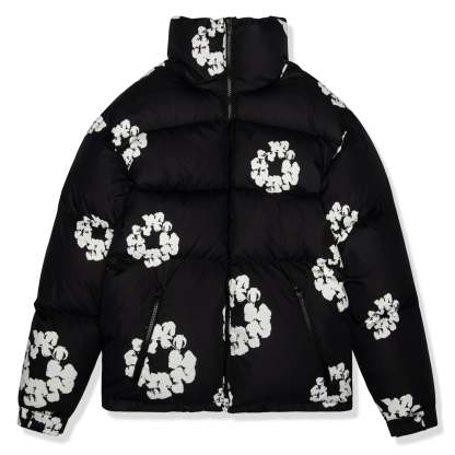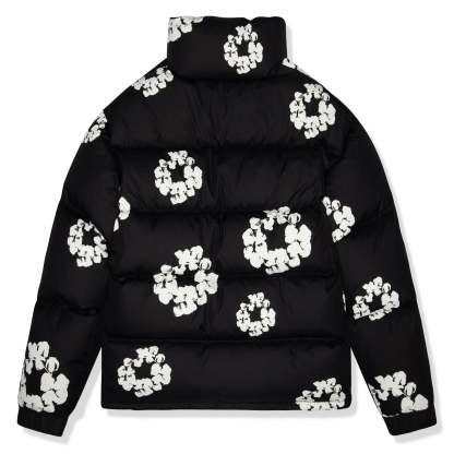 Warmth and striking style are combined in the Denim Tears Cotton Wreath Black Puffer Jacket. Its sleek black style and embroidered cotton wreath motif combine contemporary streetwear aesthetics with cultural storytelling. It is lightweight, insulated, comfortable, and long-lasting, making it ideal for cold days. It is a unique item for anyone wishing to make a statement while being warm.